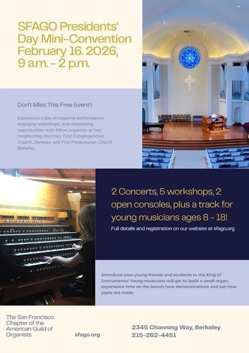 We are hosting events throughout the day at two churches in Berkeley within a block each other: First Church (2345 Channing Way, Berkeley, CA 94704) and First Presbyterian (2407 Dana St, Berkeley, CA 94704). There is also a youth track geared towards young musicians aged 8-18 curious about the organ regardless of prior experience!